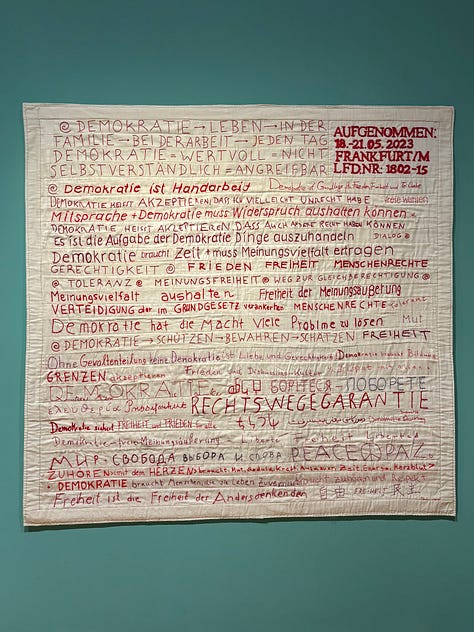 I think what really struck me about the quilt was how devastatingly large it is, somehow though, the sense of community and togetherness that it creates was equally as heartwarming. I think that’s partly why I have such a soft spot for fiber and textile art, the collectivity created not only through the meaning of the pieces but the historical tradition it holds creates another point of connection. I recently went to see the exhibition of the European Quilt Triennial in the Textile Museum of St. Gallen and this is the sentiment that stuck with me. Here are some of my favorite pieces: