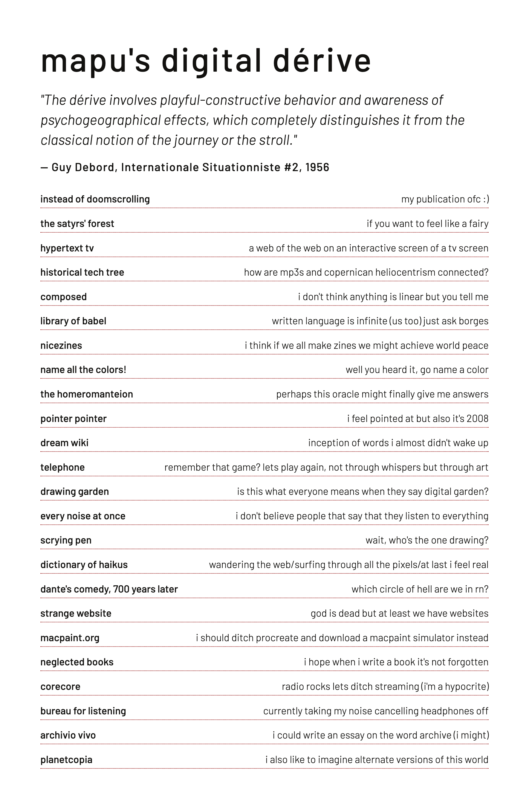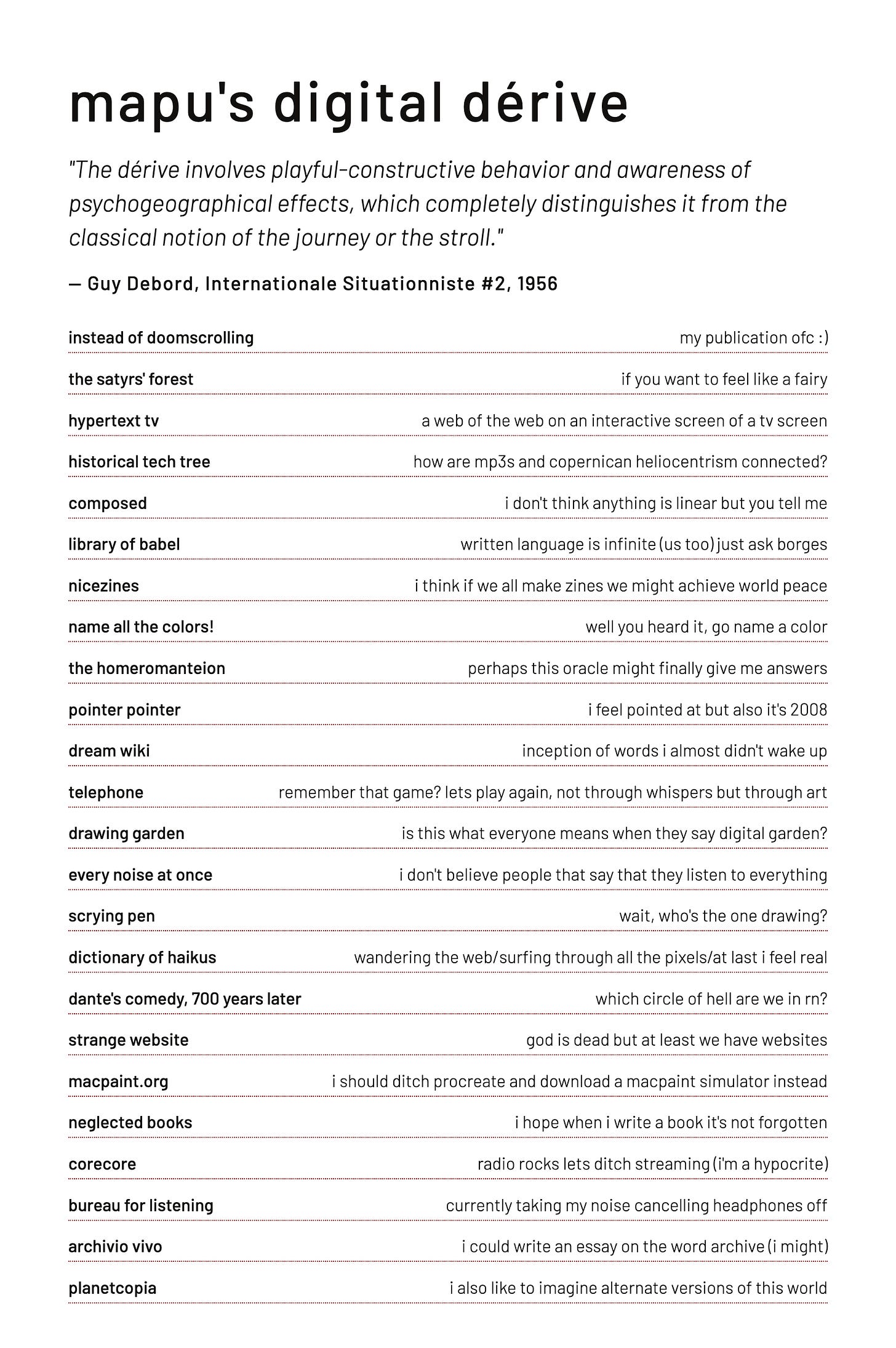 Thanks, Mapu, for reaching out with this collaboration. I love the idea of digital dérive on the indie web because, in my view, they are a perfect match. The alt web was built for purposeful exploration at one’s own pace.