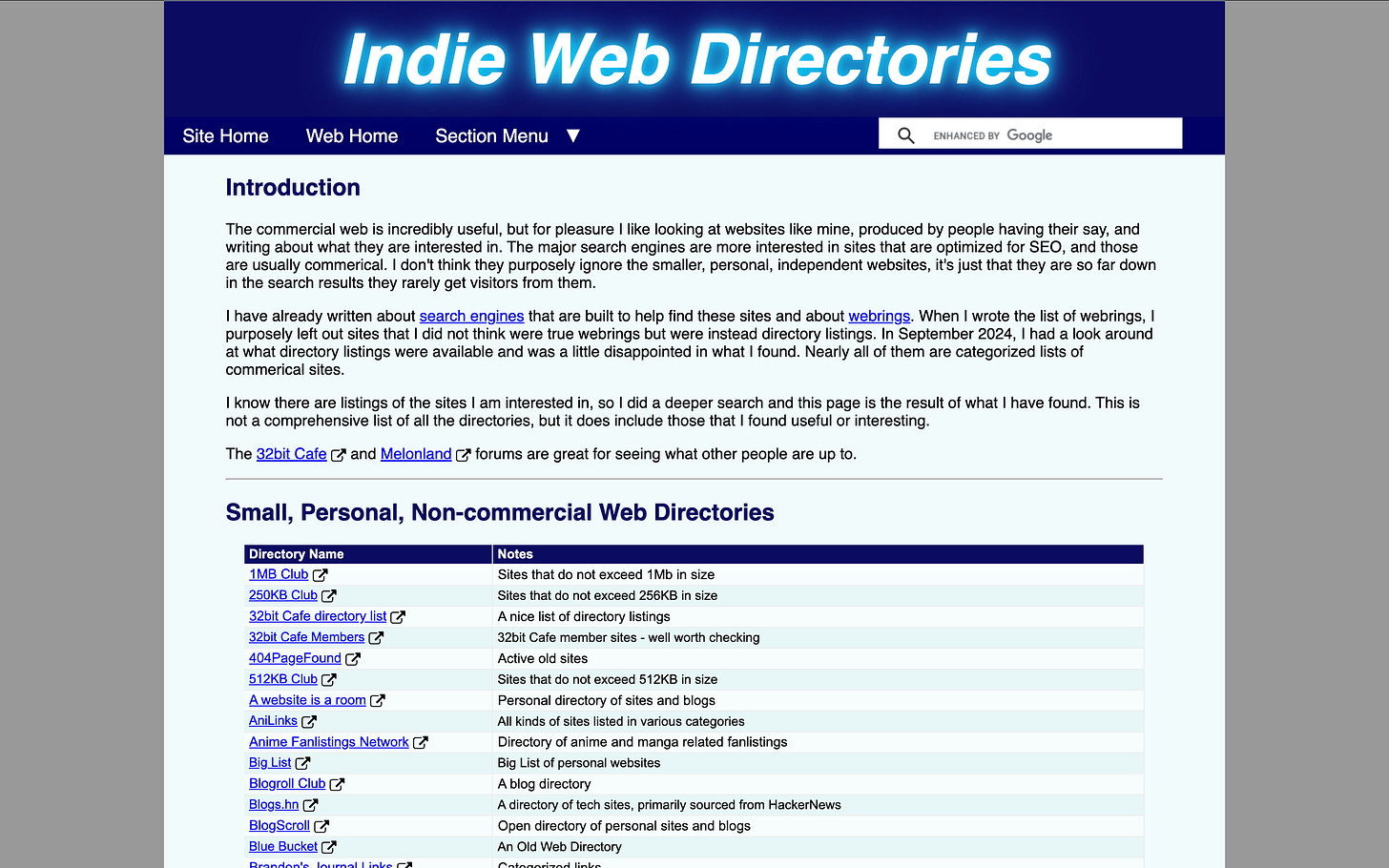 There are also site directories, like this explorer from Marginalia.nu and this giant list from Bisray. Many personal sites also have a friends & recommendations sidebar, like the one on Kicks Condor’s site (on the righthand side as you scroll).